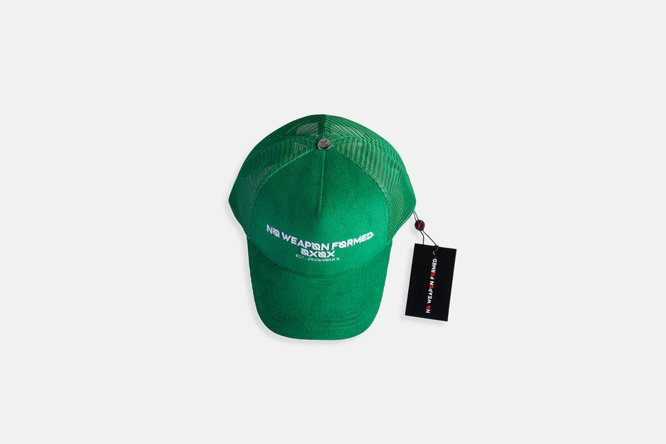 The Corduroy Trucker Hat features the No Weapon Formed brand logo in 3D puff embroidery across the front, the design is finished with the OXOX seal and founding year stitched in crisp white for a bold, high-contrast statement.