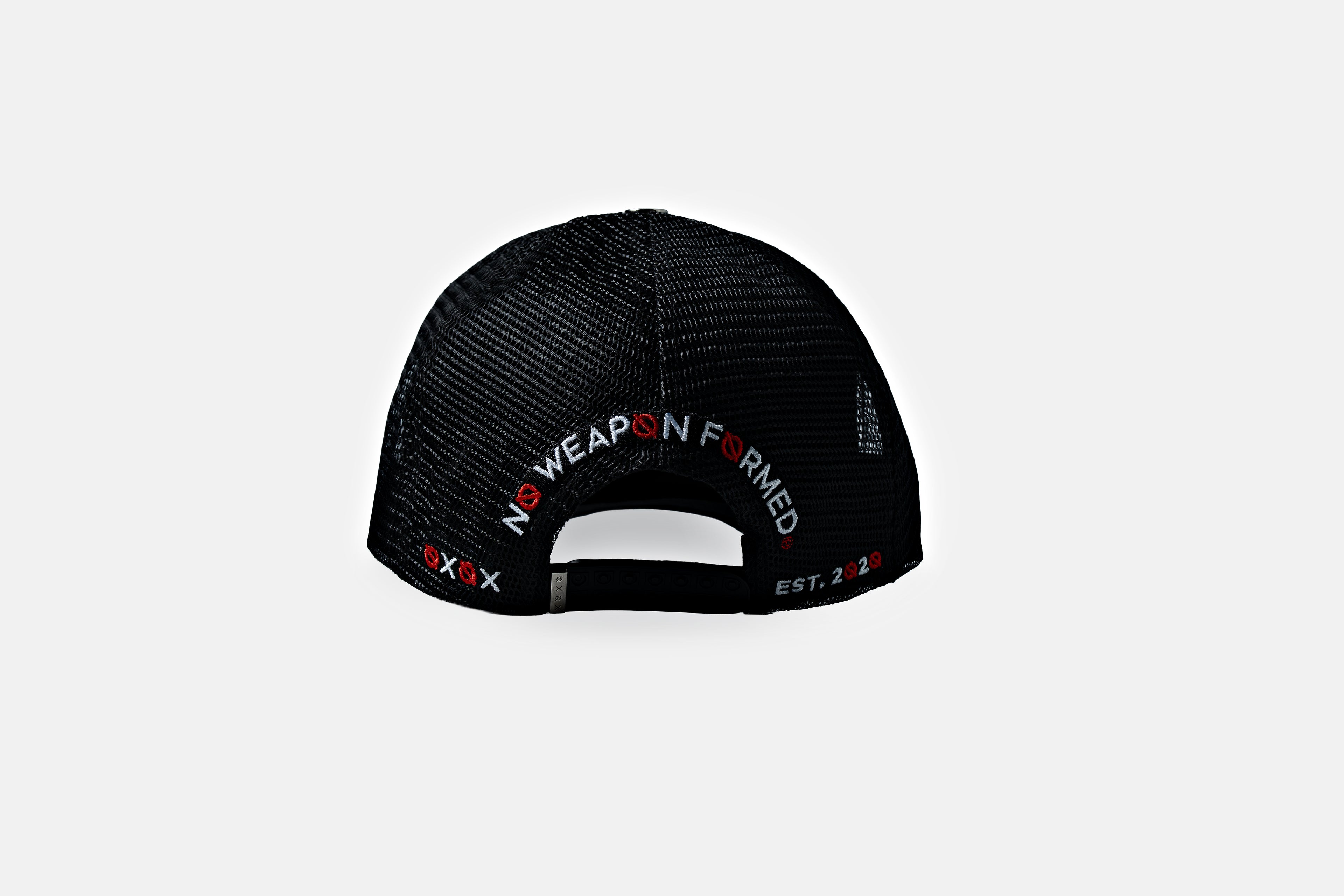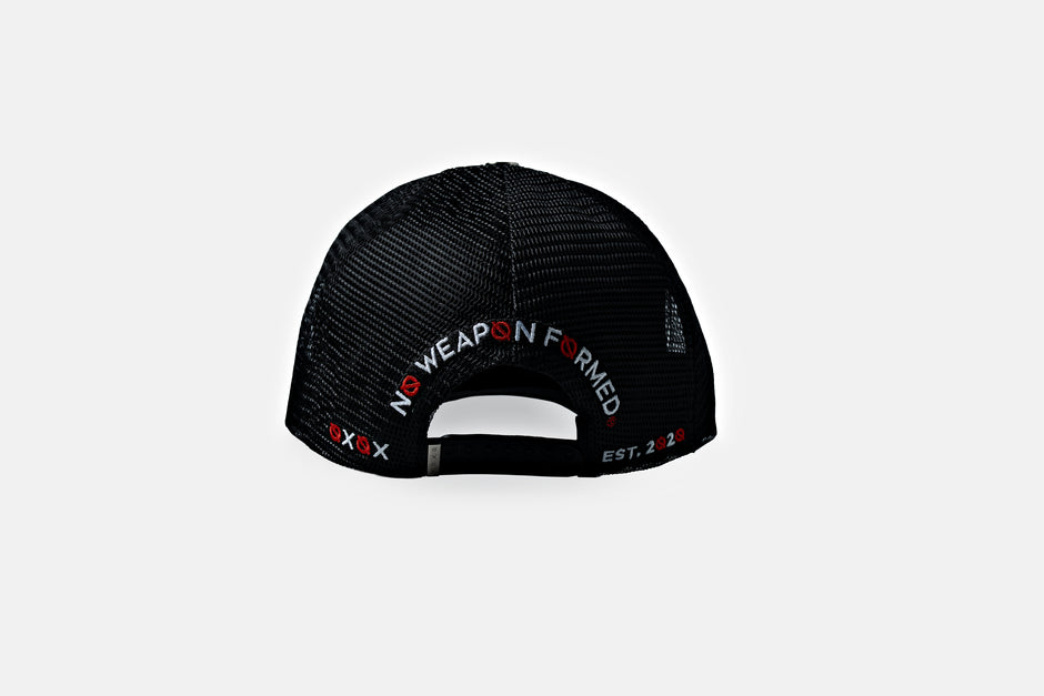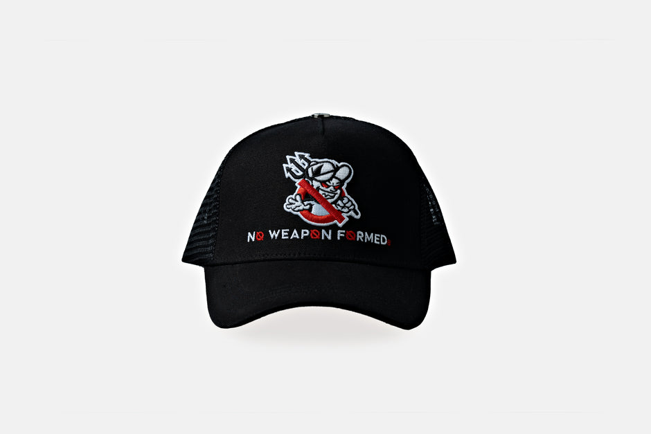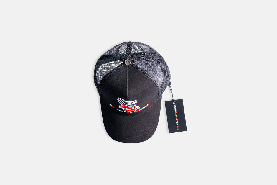 The No Devil No Weapon Logo 5-panel snapback is built from pure black canvas with a curved 7 cm brim and durable double-snapback fastening. A bold half-devil graphic rises above the NO WEAPON FORMED. logo in crisp puff embroidery. Pure White and red details cut through the black base, from the front logo to the OXOX side mark and EST. 2O2O label hits across the panels. Finished with a black satin tape and printed logo label, this piece delivers luxury streetwear construction with symbolic edge—clean, protective, and defiant.