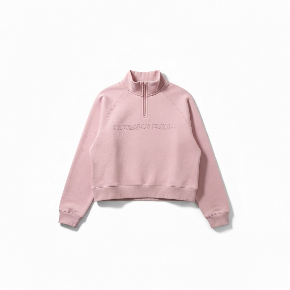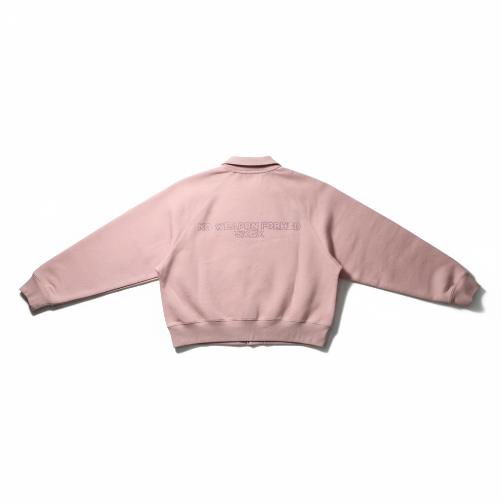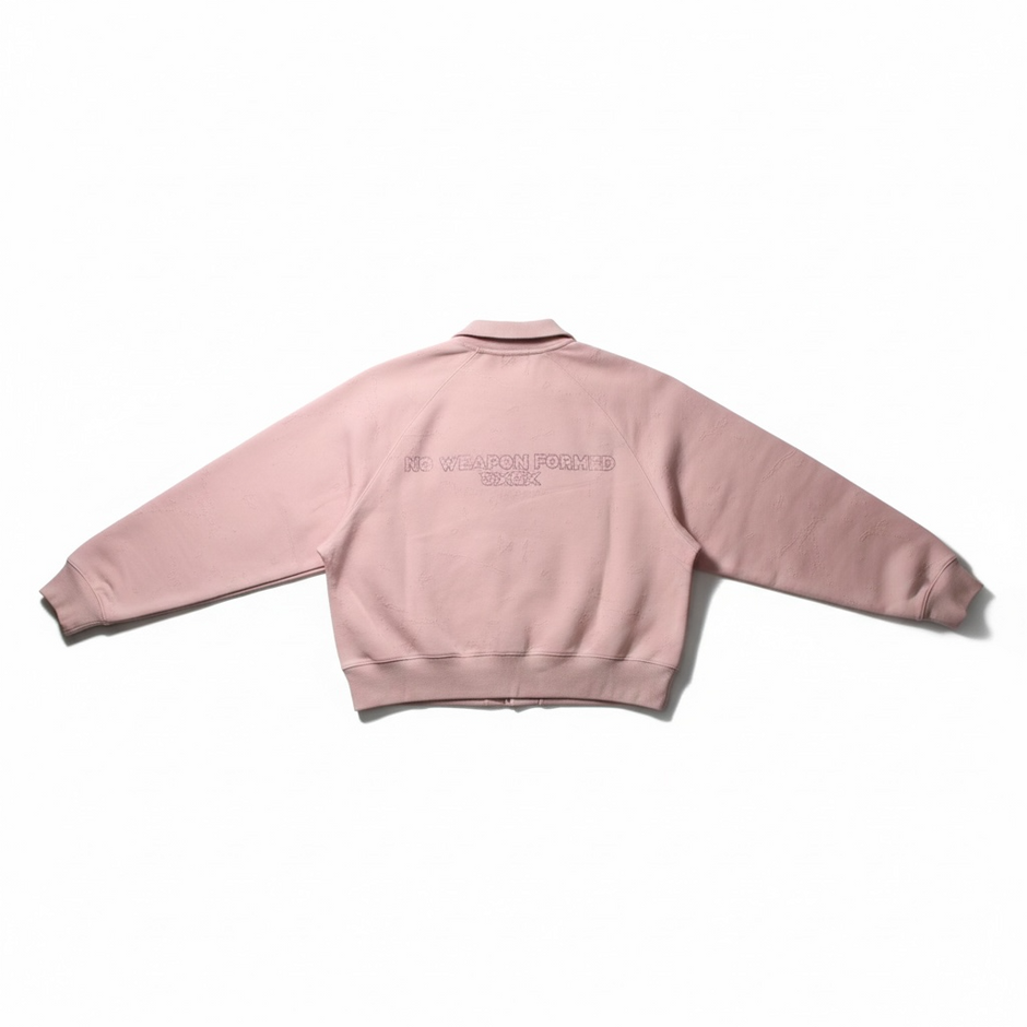The signature NO WEAPON FORMED® mark is threaded or laser-etched into the garment, creating a durable finish that represents resilience and protection. A bold Pantone red drawstring contrasts the soft pink tone, adding a subtle yet striking design detail.