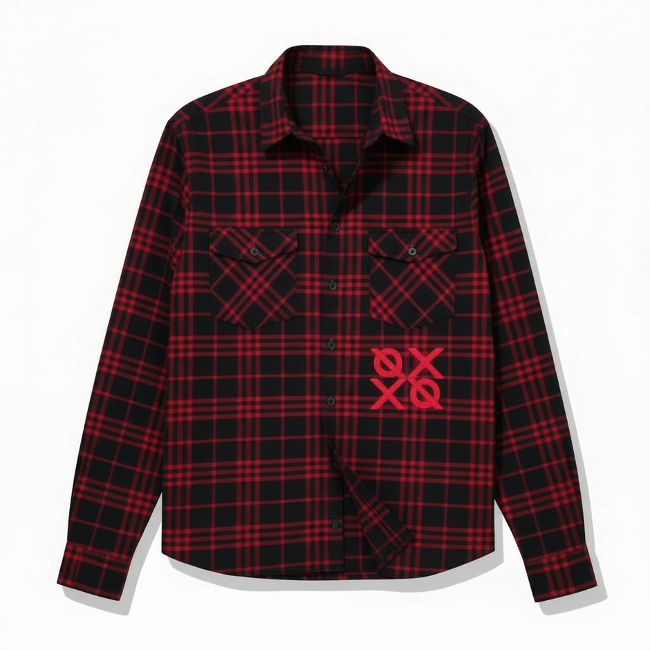 The front is finished with satin stitch OXOX embroidery, positioned deliberately to stand out against the plaid without disrupting the pattern. The embroidery is dense, raised, and precision-stitched—designed to hold its shape, resist fraying, and maintain clarity over time.