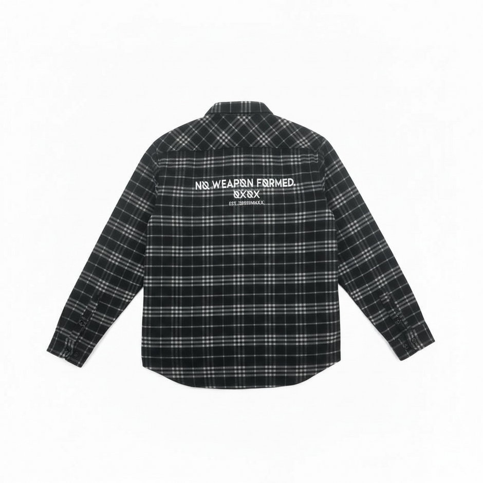 The NO WEAPON FORMED® Heavy Flannel Shirt/Jacket “Shacket” is engineered for structure, warmth, and presence—designed to move seamlessly between layers and seasons.