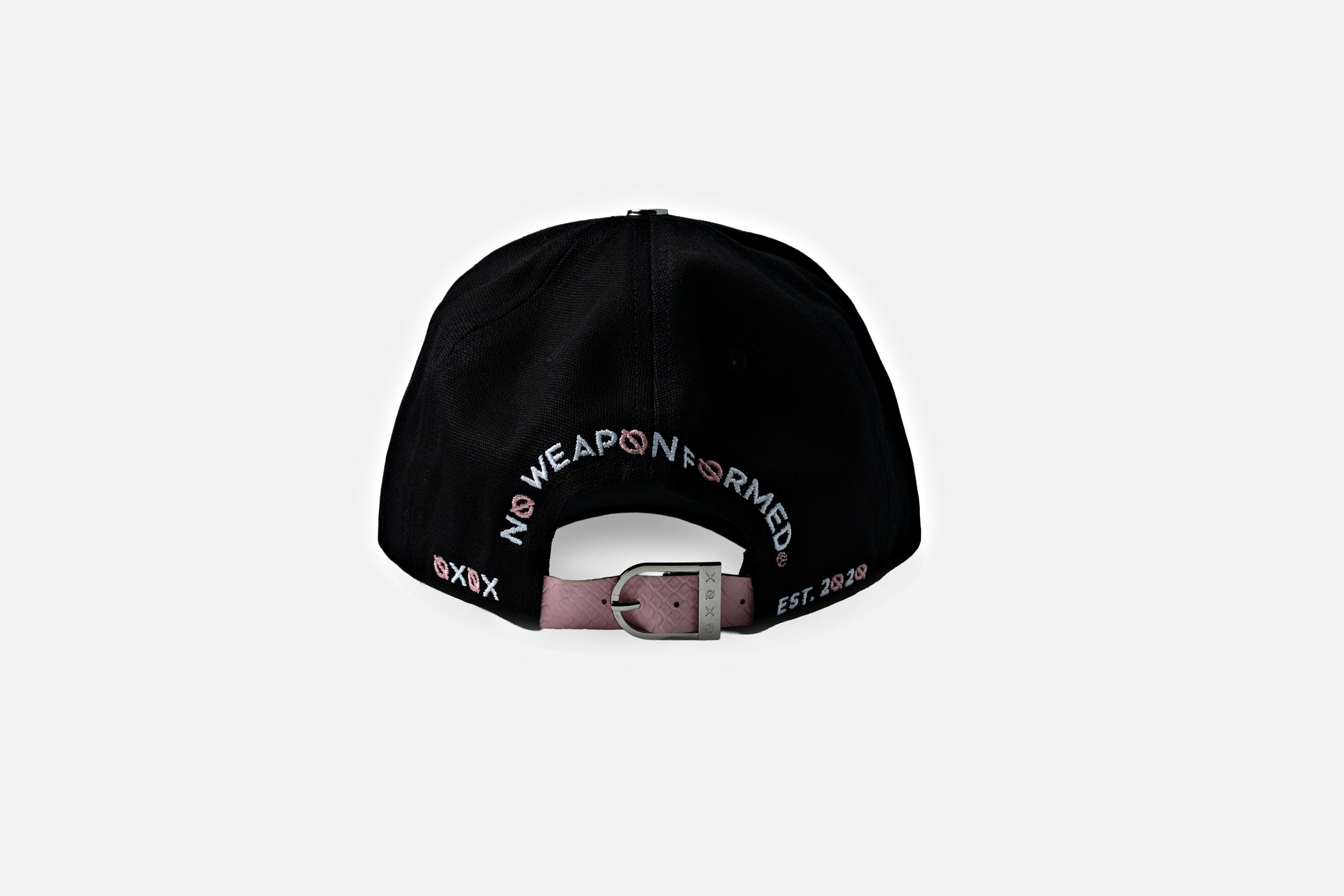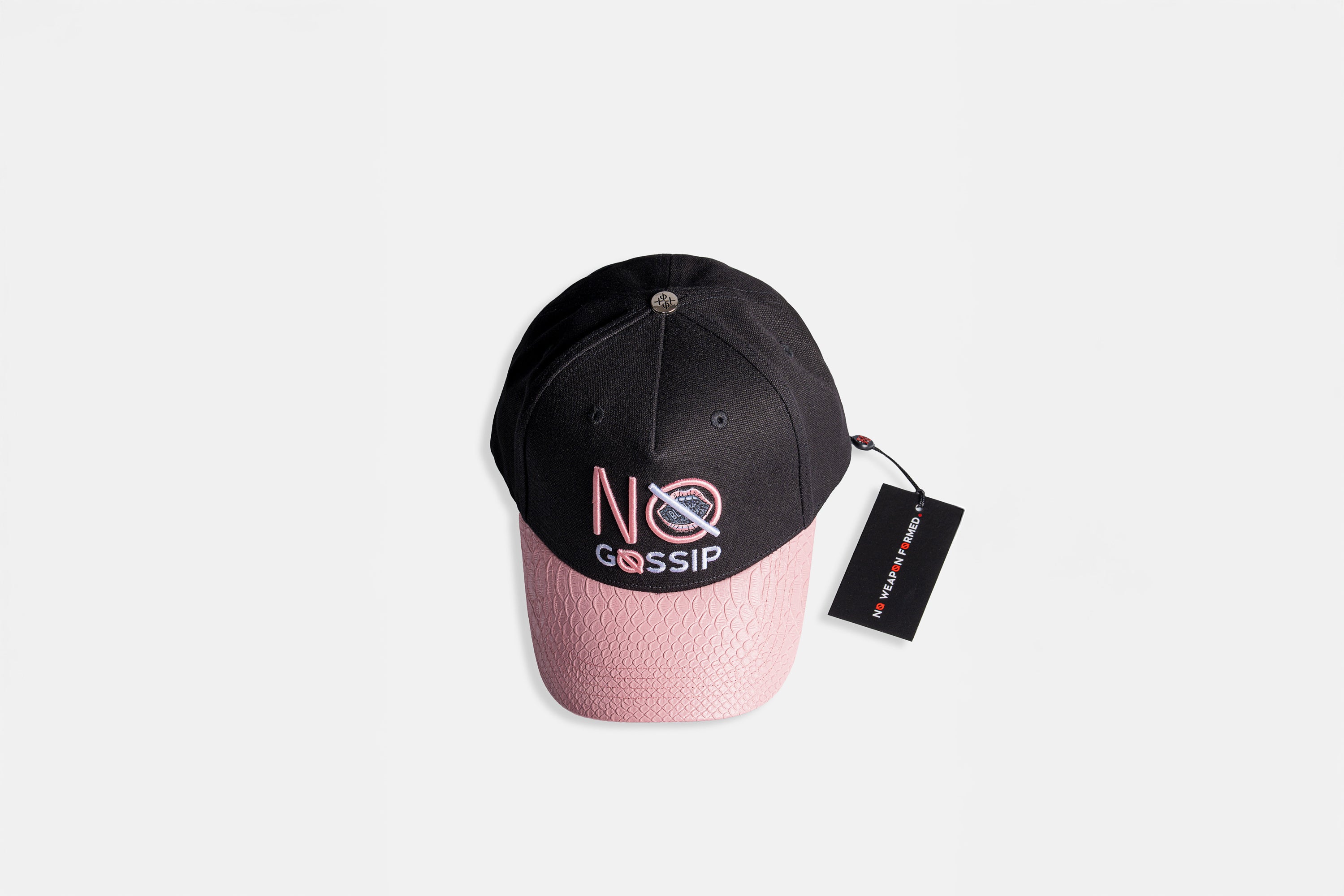 The crown features “NO GOSSIP” in striking embroidery, with the “O” executed in puff print for extra emphasis. Across the back, lips and brand detailing reinforce the message, while side and rear hits carry the mantra "NO WEAPON FORMED ®" The standout feature—a pink snakeskin brim —ties directly to the Year of the Snake theme, adding both bite and edge to the design.