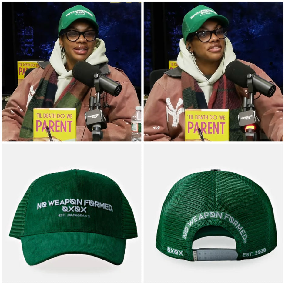 The Corduroy Trucker Hat features the No Weapon Formed brand logo in 3D puff embroidery across the front, the design is finished with the OXOX seal and founding year stitched in crisp white for a bold, high-contrast statement.